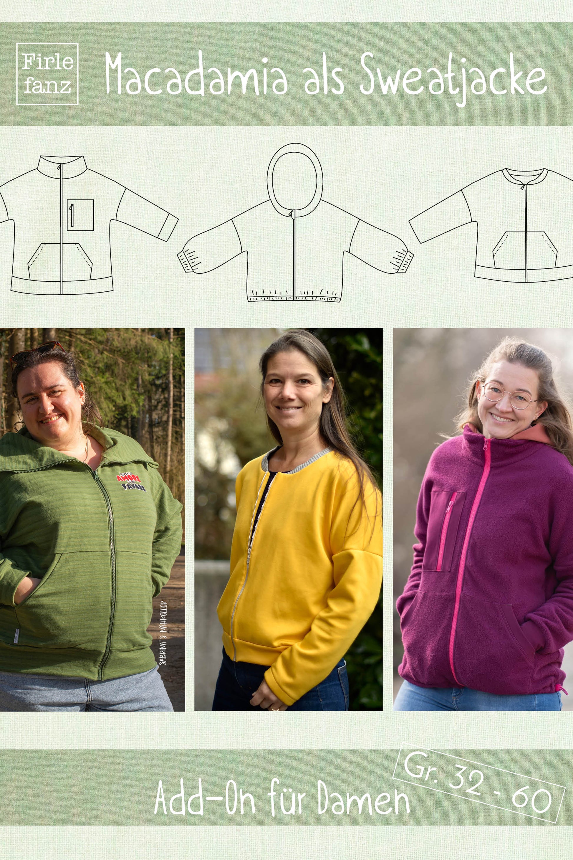 Mit diesem Add-On entsteht aus dem Sweater Macadamia im Nu eine kuschelige Sweatjacke. Aus leichtem Sommersweat ist sie perfekt zum Überziehen im Sommer oder als Ganzjahresbegleiter für Drinnen. Aus wärmeren Stoffen, wie Fleece oder Kuschelsweat ist sie auch eine tolle Outdoorjacke für den Herbst. Wenn du schon ein bisschen Näherfahrung hast. ist die Jacke leicht zu nähen.
